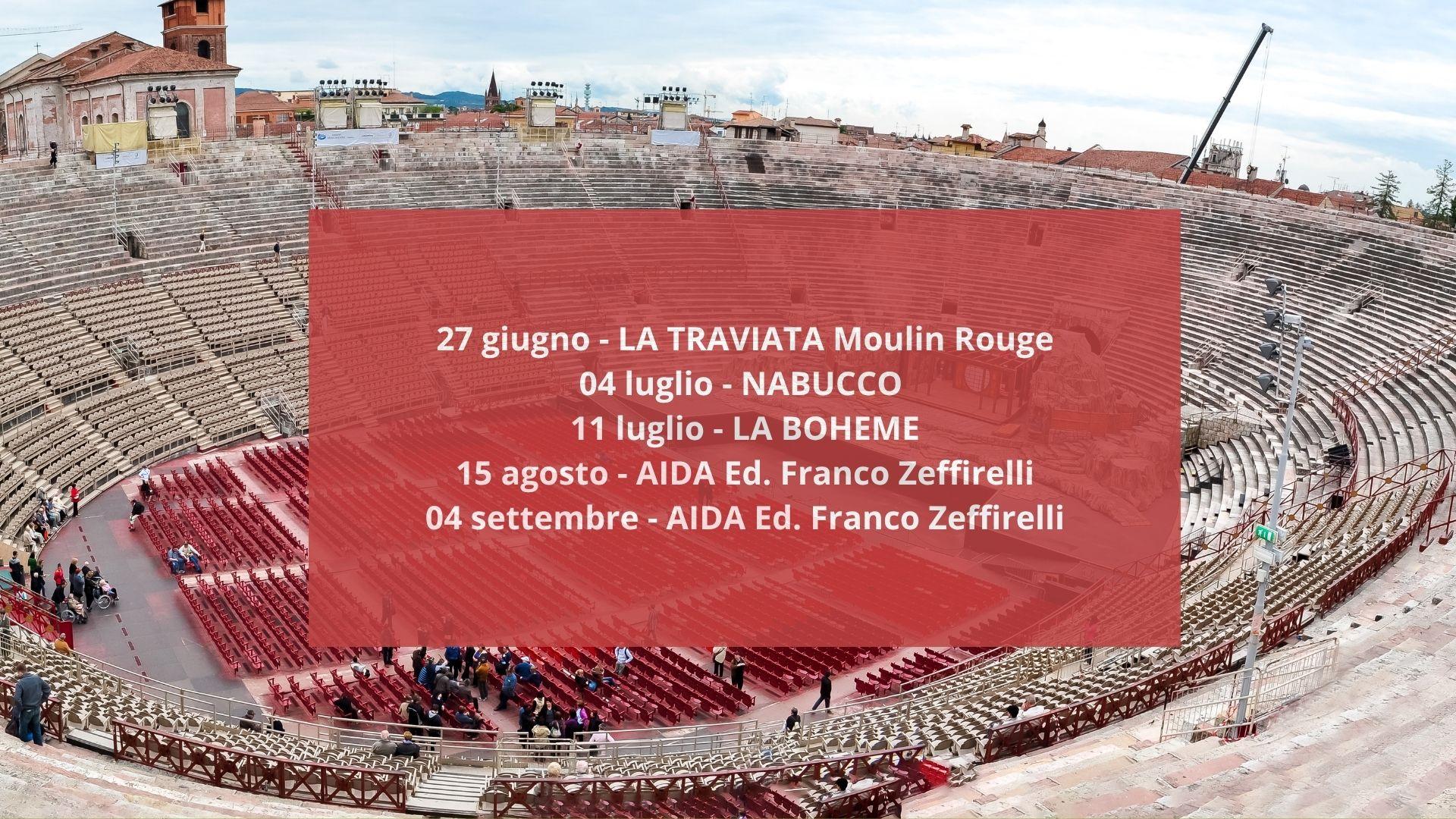Ritrovo dei Partecipanti e partenza per Verona. Giunti nei pressi dell'Arena di Verona, tempo a disposizione dei Partecipanti per fare una breve passeggiata, prima di partecipare al meraviglioso Spettacolo, inizio previsto tra le 21.00 e le 21.30.